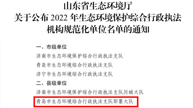 喜報!青島市生態(tài)環(huán)境局即墨分局榮獲省2022年生態(tài)環(huán)境保護(hù)綜合行政執(zhí)法機(jī)構(gòu)規(guī)范化單位