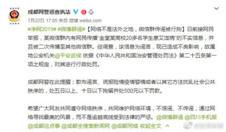 成都網警辟謠“某高校20多名學生患艾滋病”:已處罰造謠者