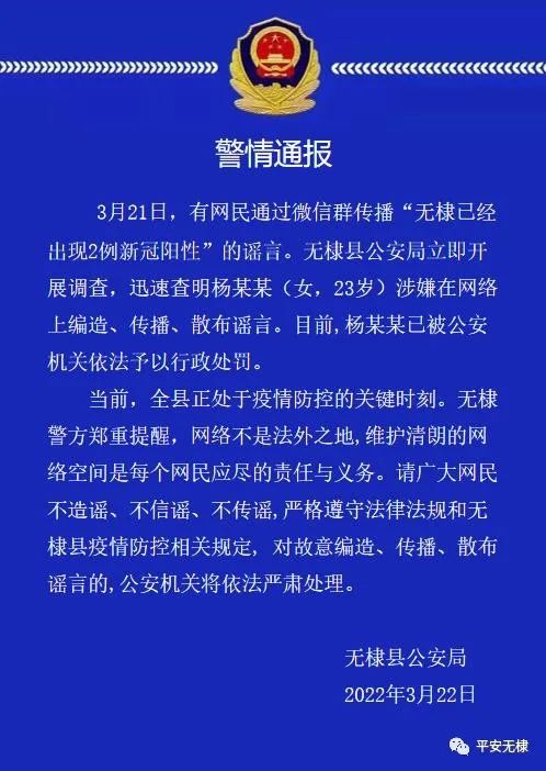 警情通報 無棣警方行政處罰1名散布涉疫情謠言人員!