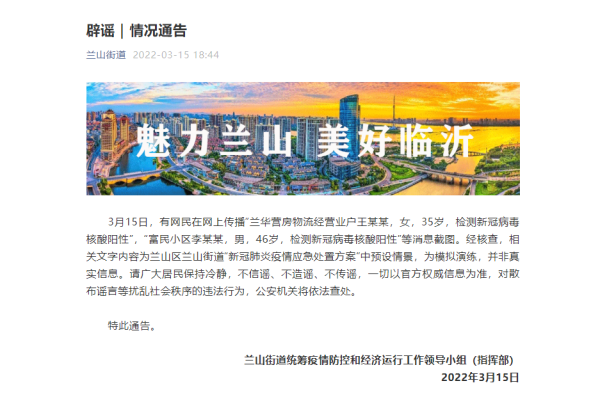 這則消息不實!臨沂市蘭山區蘭山街道發布辟謠通告
