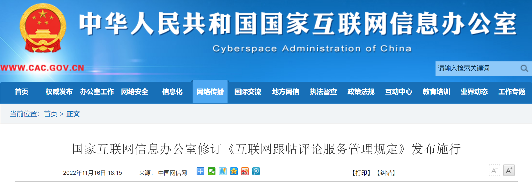 國家互聯網信息辦公室修訂《互聯網跟帖評論服務管理規定》發布施行