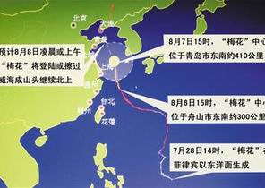 8日11時:強熱帶風暴梅花位于遼寧省丹東市以南大約240公里的黃海中部海面上,即北緯37.8度,東經123.8度,中心附近最大風力10級(25米/秒),中心最低氣壓980百帕...[詳情]