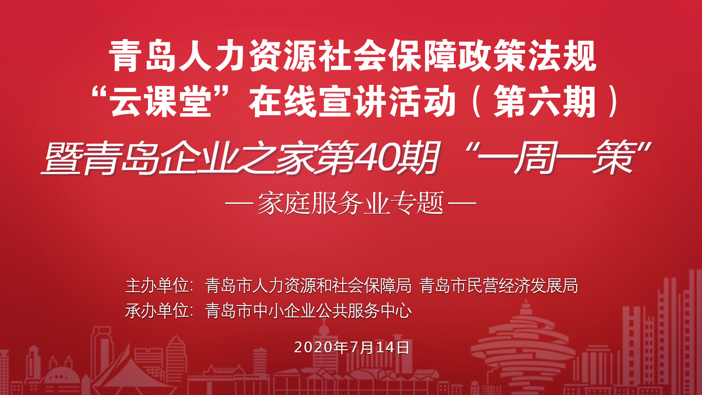 為進一步發揮人社政策惠企惠民效應,讓更多家庭服務機構更加順暢最大化的享受我市家庭服務業政策,市人力資源社會保障局擬于7月14日下午2點30分聯合市民營經濟局開展人力資源社會保障政策法規“云課堂”在線宣講活動。宣講內容為家庭服務業從業人員崗位補貼、家庭服務業就業困難人員社會保險補貼和崗位補貼、家庭服務業穩崗補貼和家庭服務業商業綜合保險補貼。